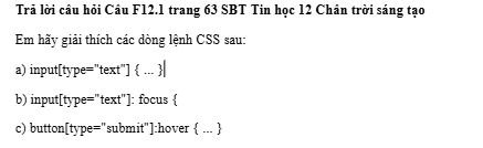 VnDoc xin giới thiệu bài Giải SBT Tin học 12 Chân trời sáng tạo bài F12: Định kiểu CSS cho biểu mẫu có đáp án chi tiết cho từng câu hỏi chương trình sách mới. Thông qua đây các em học sinh đối chiếu với lời giải của mình, hoàn thành bài tập hiệu quả.