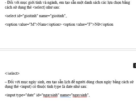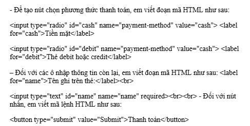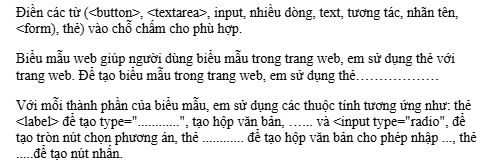 Với mỗi thành phần của biểu mẫu, em sử dụng các thuộc tính tương ứng như: thẻ < label > để tạo type="............", tạo hộp văn bản, …... và < input type="radio", để tạo tròn nút chọn phương án, thẻ ............ để tạo hộp văn bản cho phép nhập ..., thẻ .....để tạo nút nhấn.