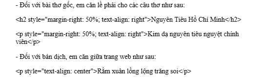 Câu 5. Em hãy định kiểu cho tựa bài thơ và các câu thơ trong Bài F1.5 bằng cách viết mã lệnh CSS cho riêng từng phần tử HTML.