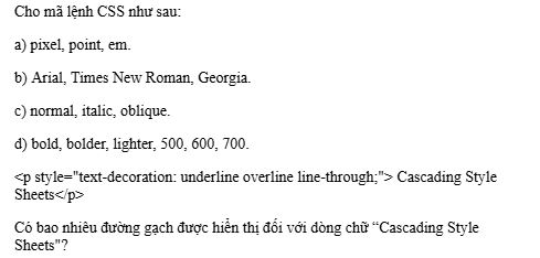 Có ba đường gạch gồm: gạch trên, gạch ngang thân (gạch bỏ) và gạch chân được hiển thị đối với dòng chữ “Cascading Style Sheets".