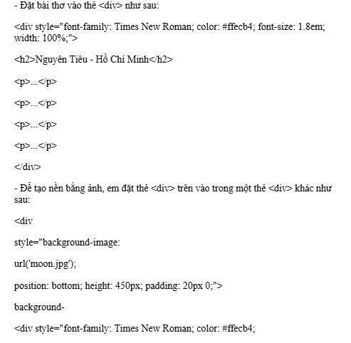 Câu 5. Hãy định kiểu cho tệp baitho.html trong Bài F7.5 theo những yêu cầu sau: