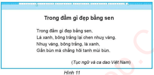 Câu 11.9 trang 42 SBT Tin học lớp 6: Bạn Minh đã soạn thảo một câu ca dao và định dạng văn bản như Hình 11. Theo em, bạn Minh đã sử dụng những lệnh nào để căn chỉnh lề của các đoạn văn bản? Giải thích?