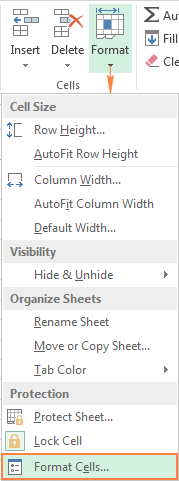 - Trong thẻ Home, chọn Format rồi chọn Format Cells …