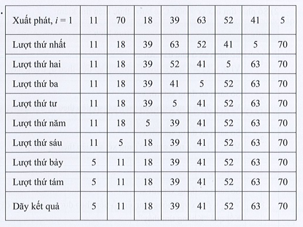 Câu F21 trang 39 SBT Tin học 7: Hãy trình bày diễn biến từng bước của thuật toán sắp xếp nổi bọt áp dụng cho dãy số {11, 70, 18, 39, 63, 52, 41, 5} để được dãy số tăng dần.