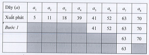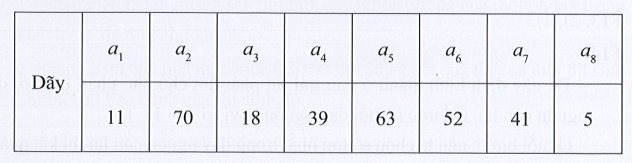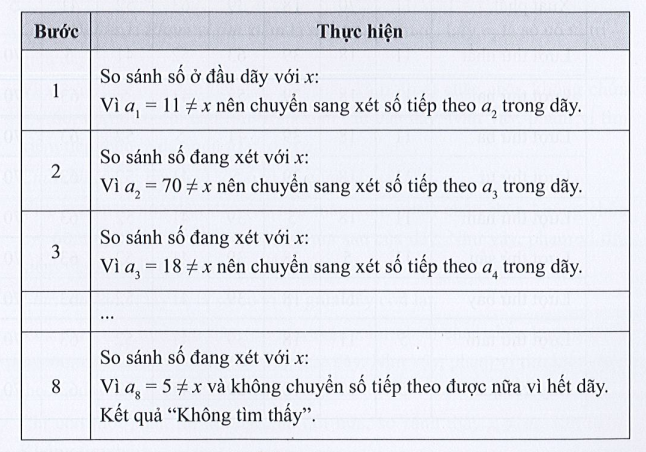 Câu F19 trang 39 SBT Tin học 7: Hãy trình bày diễn biến từng bước của thuật toán tìm kiếm tuần tự áp dụng cho dãy số {11, 70, 18, 39, 63, 52, 41, 5} để tìm: