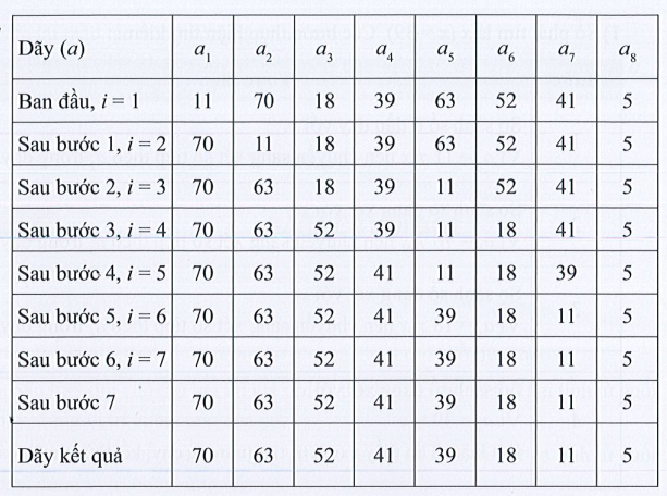 Câu F20 trang 39 SBT Tin học 7: Hãy trình bày diễn biến từng bước của thuật toán sắp xếp chọn dần áp dụng cho dãy số {11, 70, 18, 39, 63, 52, 41, 5} để được dãy số giảm dần.