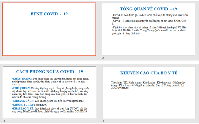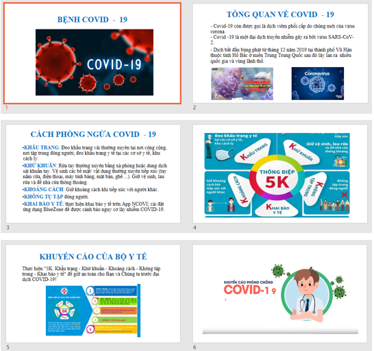 Câu E74 trang 34 SBT Tin học 7: Em hãy tìm hiểu về dịch Covid 19, cách phòng chống và khuyến cáo của Bộ Y tế. Trình bày nội dung này bằng một bài trình chiếu trong PowerPoint. Lưu tệp trình chiếu với tên Covid19.pptx