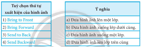 Bài 14 trang 60 Sách bài tập Tin học 7: Ghép mỗi tuỳ chọn thứ tự xuất hiện của hình ảnh ở cột trái với ý nghĩa ở cột bên phải cho phù hợp.