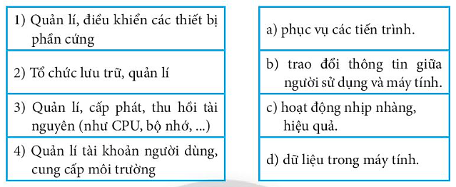 Bài 6 trang 9 Sách bài tập Tin học 7: Em hãy ghép mỗi mục ở cột bên trái với mục ở cột bên phải để mô tả đúng về chức năng của hệ điều hành.