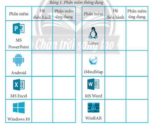 Bài 7 trang 9 Sách bài tập Tin học 7: Đánh dấu (✓) để phân biệt phần mềm là hệ điều hành hay phần mềm ứng dụng trong Bảng 1 dưới đây.