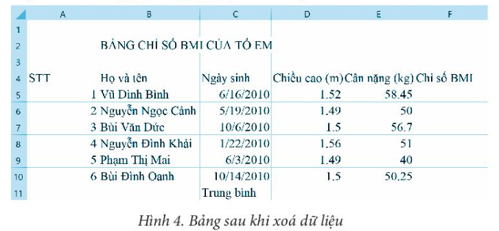 Bài 9 trang 33 Sách bài tập Tin học 7: Mở tệp Bang_chi_so BMI_cua_To đã được lưu ở Bài 7, thực hiện xóa dữ liệu trong khối ô tính F5: F11 và D11:E11 để có bảng tính như Hình 4.