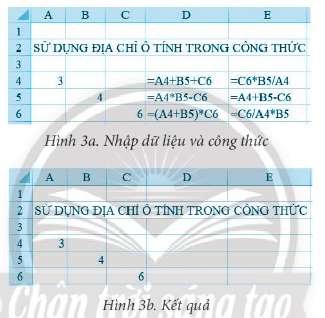 Bài 8 trang 33 Sách bài tập Tin học 7: Khởi động MS Excel thực hiện nhập dữ liệu và công thức như Hình 3a và điền kết quả vào các ô tính tương ứng ở trong Hình 3b.