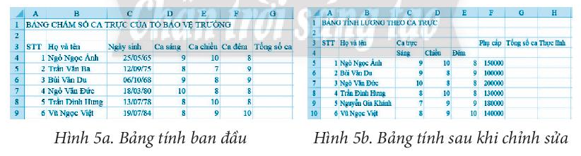 f) Thực hiện chỉnh sửa tiêu đề bảng tính và nhập dữ liệu cho cột Phụ cấp, đánh lại số thứ tự để có bảng tính tương tự Hình 5b.