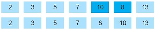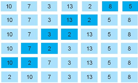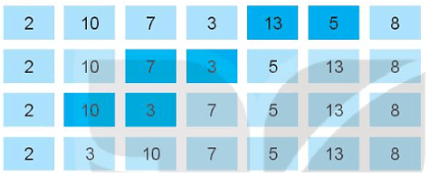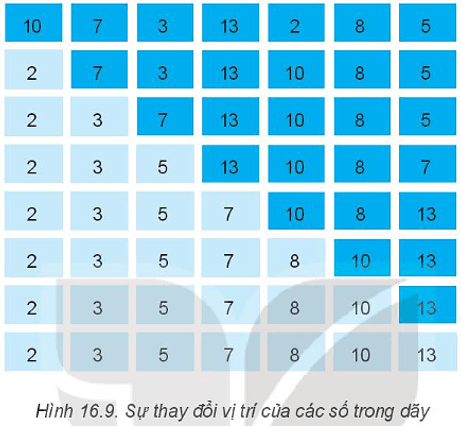 Câu 16.14 trang 61 SBT Tin học 7: Em hãy quan sát dãy gồm các số: 10, 7, 3, 13, 2, 8, 5 được thay đổi vị trí theo từng bước như trong Hình 16.9