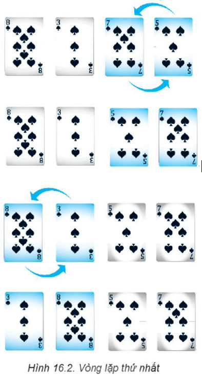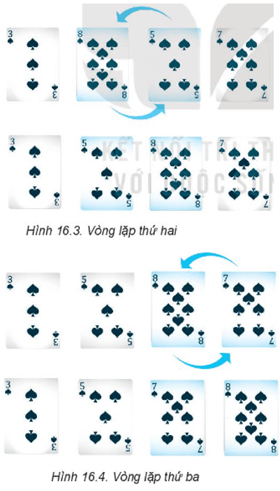 Bạn An sắp xếp các quân bài bằng cách tráo đổi vị trí theo các vòng lặp như trong các hình sau: