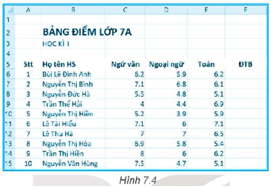 Câu 7.17 trang 27 SBT Tin học 7: Thực hành: Nhập bảng điểm lớp 7A theo mẫu Hình 7.4