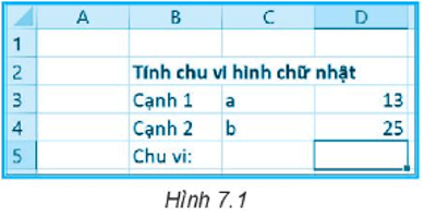 Câu 7.5 trang 24 SBT Tin học 7: Công thức nào sau đây là đúng khi nhập vào ô D5 trong Hình 7.1 để tính chu vi hình chữ nhật?