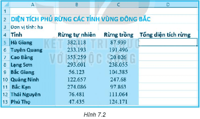 Câu 7.6 trang 24 SBT Tin học 7: Cần nhập công thức nào vào ô D5 trong Hình 7.2 để tính Tổng diện tích rừng của tỉnh Hà Giang?