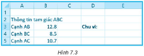 Câu 7.8 trang 25 SBT Tin học 7: Cho trang tính như Hình 7.3 cần nhập công thức tính chu vi tam giác ABC vào ô E3.