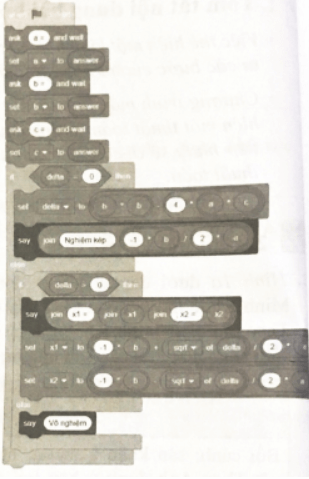 Câu F2 trang 50 SBT Tin học 8: Bạn Minh Tú tạo chương trình như trong Hình 2 để giải phương trình bậc hai ax2+bx+c=0 với các hệ số a, b, c nhập vào từ bàn phím. Chương trình chưa chạy đúng vì thứ tự các câu lệnh chưa đúng. Em hãy sửa giúp bạn Minh Tú để được chương trình đúng