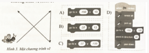 Câu F3 trang 50 SBT Tin học 8: Em hãy ghép các lệnh cho sẵn (nhãn A, B, C, D) dưới đây theo thứ tự để có chương trình vẽ Hình 3