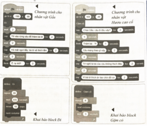 Nên tổ chức một số thao tác thành chương trình con (My Blocks) để dễ quản lí chương trình, ví dụ Đi của gấu và Gặm cỏ của Hươu cao cổ như dưới đây. Nếu không dùng My Blocks thì thay vào lệnh gọi Đi bằng đoạn lệnh dùng để định nghĩa Đi