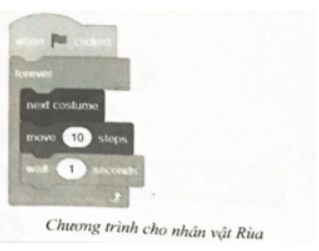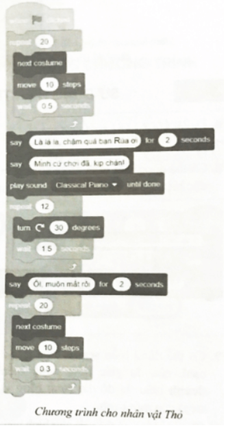 Câu F5 trang 51 SBT Tin học 8: Với kịch bản Thỏ chạy thi với Rùa như ở Hình 5 dưới đây, em hãy viết thuật toán mô tả kịch bản đó. Hãy tạo chương trình Scratch thể hiện thuật toán em vừa viết
