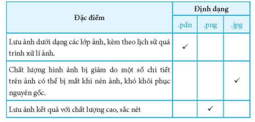 Câu 10 trang 62 SBT Tin học 8: Trong Bảng 4, hãy đánh dấu v để chọn những đặc điểm chính của mỗi định dạng tệp ảnh.