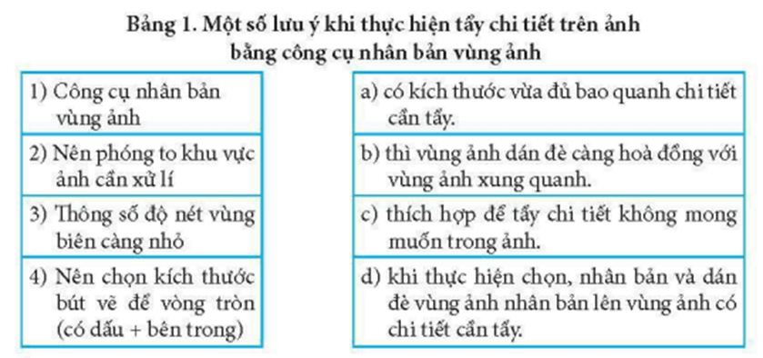 Câu 4 trang 60 SBT Tin học 8: Trong Bảng 1, hãy ghép mỗi mục ở cột bên trái với một mục ở cột bên phải để được một phát biểu đúng về tẩy chi tiết trên ảnh.