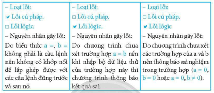 Câu 2 trang 78 SBT Tin học 8: Hãy xác định loại lỗi, nguyên nhân gây lỗi trong mỗi chương trình dưới đây.