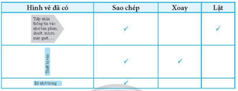 Câu 2 trang 36 SBT Tin học 8: Ở Hình 1 có 3 cặp hình vẽ: Cặp hình ngũ giác, cặp hình Thiết bị vào, Thiết bị ra, cặp hình Bộ nhớ trong, Bộ nhớ ngoài. Trong bảng dưới đây, hãy chọn các thao tác cần thực hiện để tạo được hình vẽ còn lại từ hình vẽ đã có (nội dung chữ sẽ được cập nhật riêng).