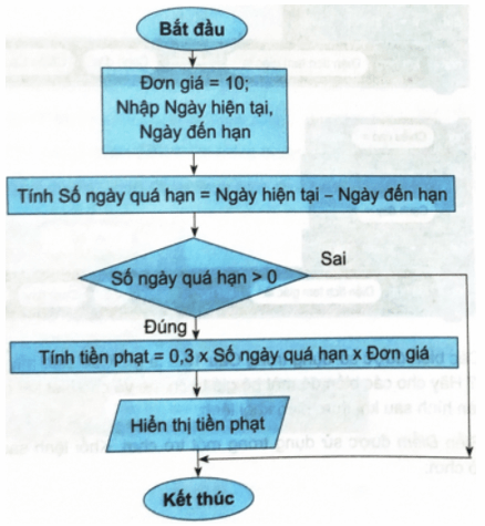 Câu 13.10 trang 64 SBT Tin học 8: Cho sơ đồ khối thuật toán tính tiền phạt đối với hàng hoá quá hạn như Hình 13.2.