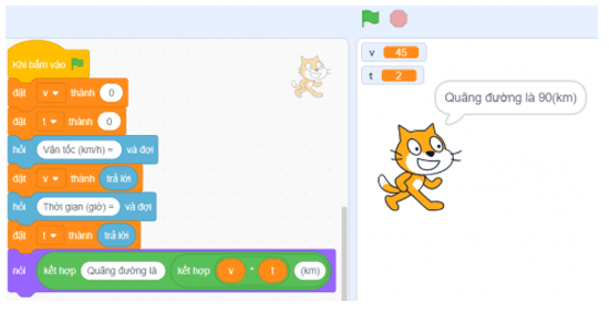 Câu 13.5 trang 61 SBT Tin học 8: Thực hành: Em hãy tạo chương trình Scratch tính quãng đường đi của một phương tiện dựa trên vận tốc và thời gian theo công thức s = v × t