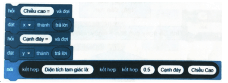 Kết quả hiển thị trên màn hình sau khi thực hiện khối lệnh là “Diện tích tam giác là 10".