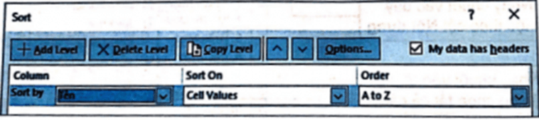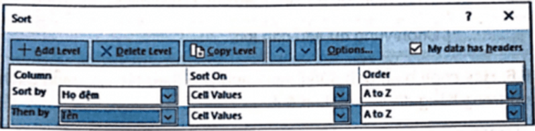 Câu 6.3 trang 20 SBT Tin học 8: Cho bảng dữ liệu như Hình 6.4. Hãy chọn hình ảnh hộp thoại Sort thực hiện việc sắp xếp theo hai tiêu chí Tên và Họ đệm theo thứ tự tăng dần.