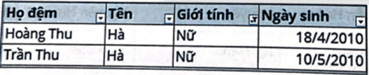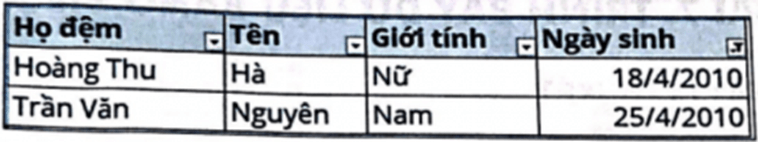Câu 6.8 trang 22 SBT Tin học 8: Hãy chọn kết quả của bảng dữ liệu ở Hình 6.4 sau khi thực hiện lọc danh sách học sinh có giới tính nữ và có ngày sinh trong tháng 4.