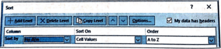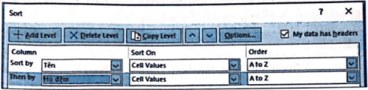 Chọn vùng dữ liệu cần sắp xếp. Trong hộp thoại Sort, thực hiện các lệnh theo hướng dẫn ở Hình 6.1 hoặc Hình 6.2. |