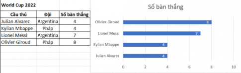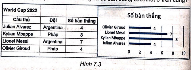 Câu 7.8 trang 26 SBT Tin học 8: Cho dữ liệu và biểu đồ của bảng xếp hạng số bàn thắng của các cầu thủ trong World Cup 2022 như Hình 7.3. Em cần làm gì để có biểu đồ được vẽ với số bàn thắng thấp nhất ở dưới cùng và số bàn thắng cao nhất ở trên cùng?