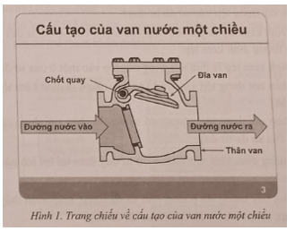 Câu 6 : Hãy tạo một bài trình chiếu để thuyết minh một sơ đồ cơ học, trong đó trang chiếu đầu tiên có đề tài bài trình chiếu là "VAN NƯỚC MỘT CHIỀU" và họ tên của sinh viên (hoặc tên nhóm). Trang chiếu thứ hai được một bộ phận cơ học với cấu tạo và nguyên lý hoạt động của van nước một chiều (ví dụ như ở Hình 1). Trao đổi và giải thích sơ đồ này theo một cách hợp lý sử dụng van nước đó. Tóm tắt giải thích vào các trang chiếu tiếp theo.