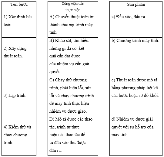 Câu 5: Ghép mỗi tên bước trong quy trình giao bài toán cho máy tính giải quyết với công việc cần thực hiện và sản phẩm tương ứng.