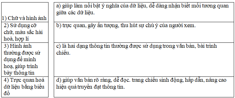 Câu 4: Ghép mỗi nội dung trình bày ở cột bên trái với một mục ở cột bên phải cho phù hợp.