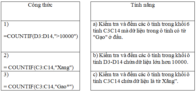 Câu 2: Chọn phương án đúng. Cách viết hàm COUNTIF trong Excel là