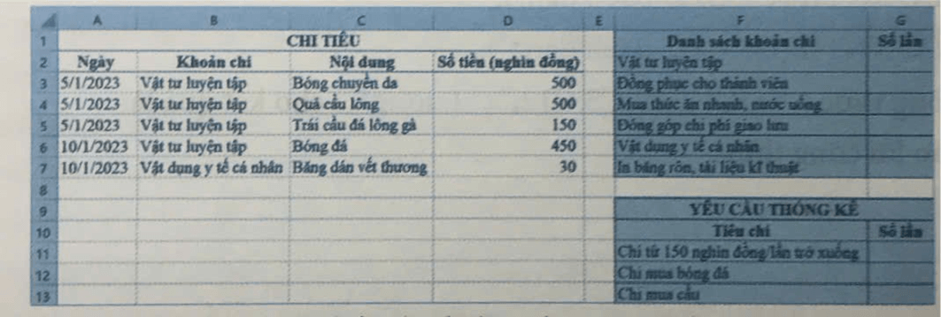 c) Trong trang tính Chi, nhập công thức tại các ô tỉnh: G11 là =COUNTIF (D3:D7, "<=150"); G12 là-COUNTIF(C3:C7, "Bóng dá"); G13 là-COUNTIF (C35C7, *cầu*").