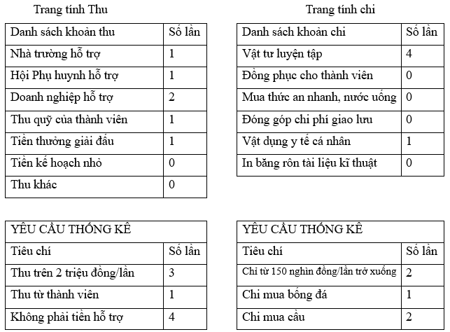 a) Sử dụng hàm COUNTIF để đếm số lần thu theo từng khoản thu, số lần chi theo từng khoản chi