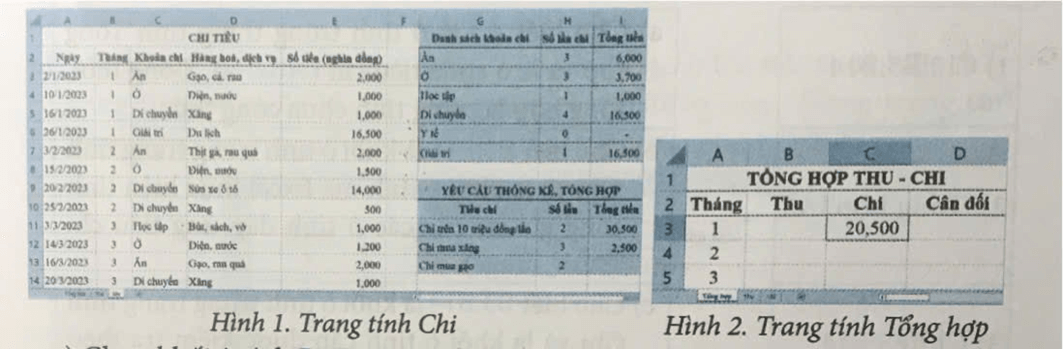 Câu 3: Dựa vào Hình I và Hình 2, hãy sắp xếp các thao tác dưới đây theo thứ tự thực hiện để tính tổng số tiền của các khoản chi trong tháng 1 tại ô tỉnh C3 trong trang tính Tổng hợp.