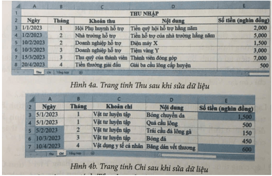 - Tại trang tính Chi, thay đổi dữ liệu tại ô tính A5 từ 5/1/2023 thành 5/2/2023; ô tính A6 từ 10/1/2023 thành 10/3/2023; ô tính A7 từ 10/1/2023 thành 10/4/2023; ô tính E3 từ 500 thành 1500; ô tính E7 từ 30 thành 600 (Hình 4b).
