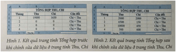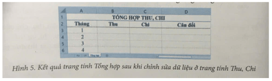 - Điền kết quả trang tính Tổng hợp đã được tự động cập nhật sau khi thay đổi dữ liệu ở trang tính Thu, Chi vào các ô tính tương ứng trong Hình 5.