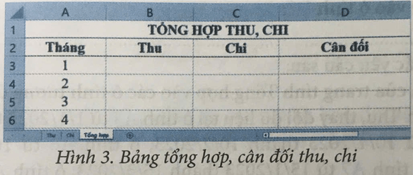 Câu 11: Mở bảng tính QuanLiTaiChinhCLB.xlsx đã tạo ở Bài 8A, thực hiện thêm trang tính mới rồi đổi tên trang tính thành Tổng hợp. Trong trung tính Tổng hợp, tạo bằng tổng hợp thu, chỉ có cấu trúc như Hình 3.