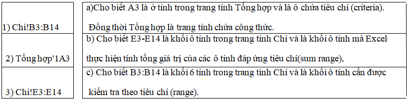 Công thức ĐúngSai=SUMIF(Chi!B14,Tổng hợp"!A3,Chi!E14)✓=SUMIF(Chi!B3:B14, Tổng hợp A3,Chi!E3:E14)✓=SUMIF(Chi!3:14, Tổng hợp!A3,Chi!3:14)✓=SUMIF(Chi!B14,Tổng hợp A3,Chi!E14)✓=SUMIF(ChiB3:B14, Tổng hợp"!A3,ChiE3:E14)✓=SUMIF(Chi!B3:B14, Tổng hợp"!A3,Chi!E3:E14) ✓=IF(Chi!B14,Tổng hợp !A3,Chi!E14)✓=IF(Chi!B3:B14, "Tong hop'!A3, Chi!E3:E14)✓