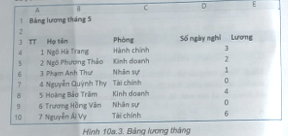 Câu 10a.9: Thực hành: Bảng dữ liệu về lương tháng của nhân viên ở một công ty được minh họa như Hình 10a.3.